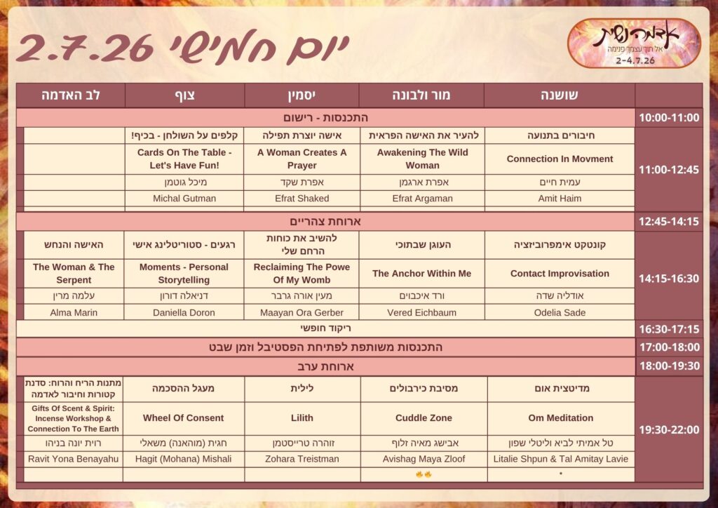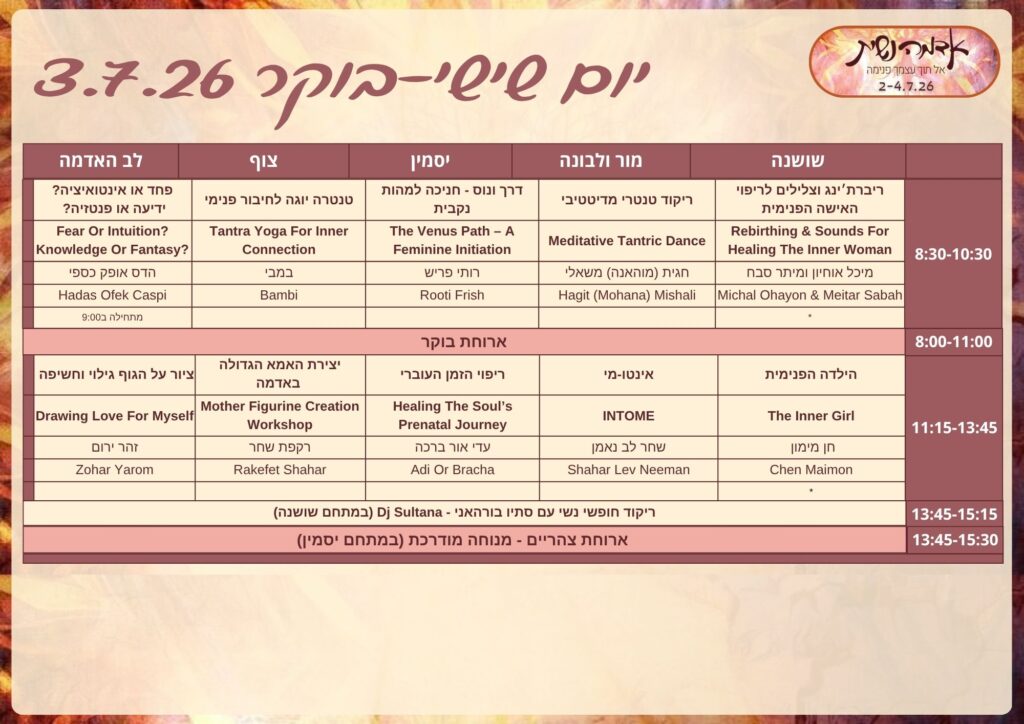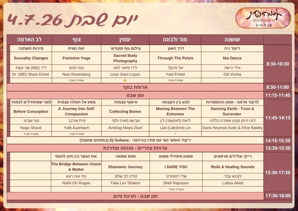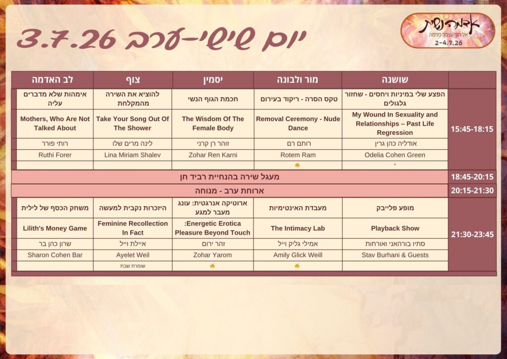 פסטיבל בוטיק קטן לנשים בלבד. העוסק בחיבור לגוף, ריפוי, מיניות ונשיות. שלושה ימים של מסע משמעותי אל תוך עצמך פנימה. עושר של מנחות וסדנאות משנות חיים.